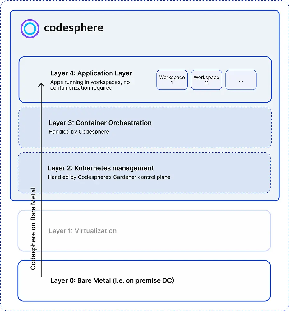 Codesphere runs anywhere—on managed Kubernetes clusters (like OpenShift or AKS), directly on VMs (in the cloud or on-prem hypervisors), or even on bare metal.